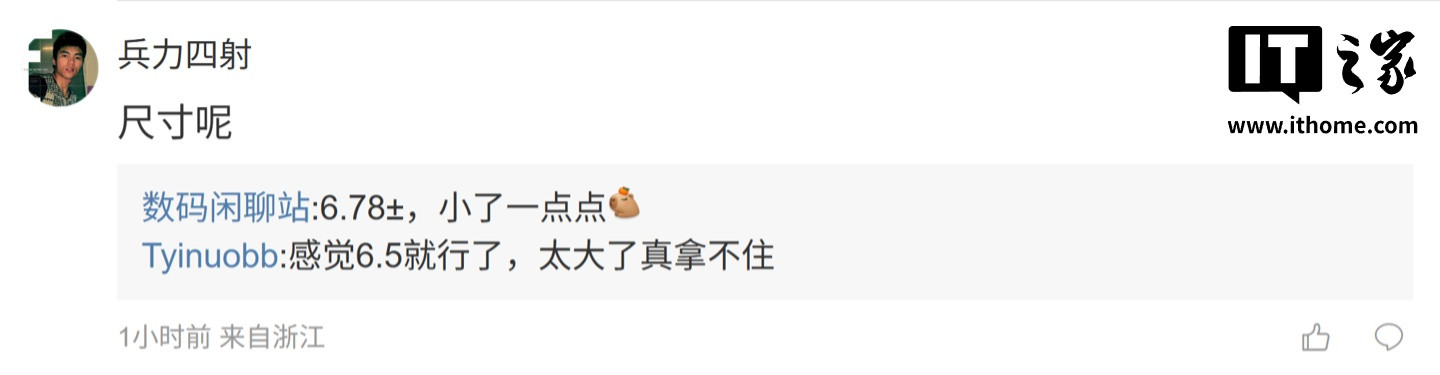 后续有用户在评论区询问:“24+1TB怎么没有”,博主回复道:“目前没有收到24GB版本的备案信息”;另一名用户则询问道:“尺寸呢”,博主则表示:“6.78±,小了一点点”。
