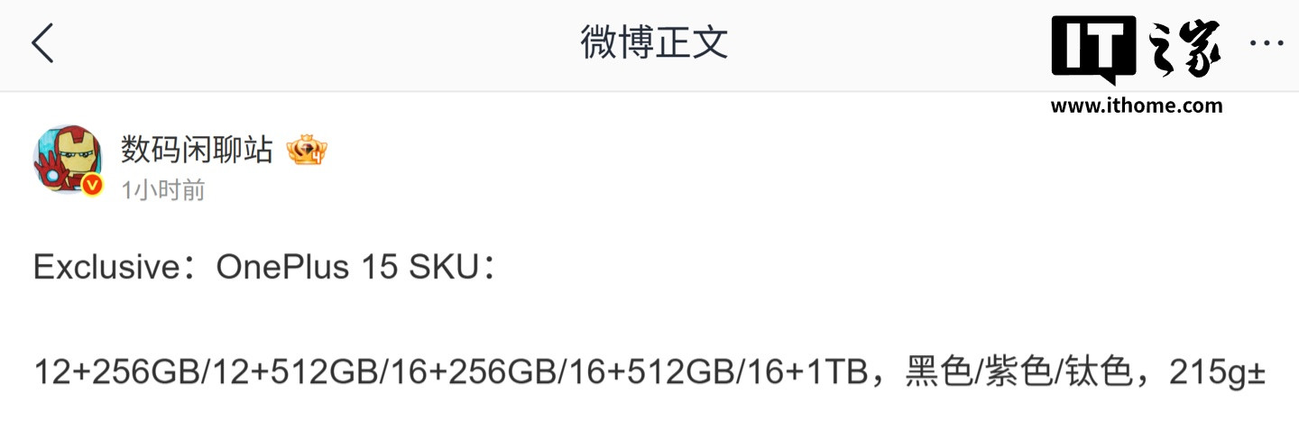 博主表示,这台手机将拥有紫色、黑色、钛色等配色,重量在215克左右,可选以下内存/存储空间配置: