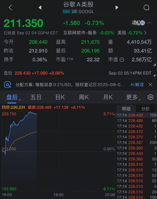 裁定公布后,谷歌母公司 Alphabet 的股票在盘后交易中暴涨 6%。