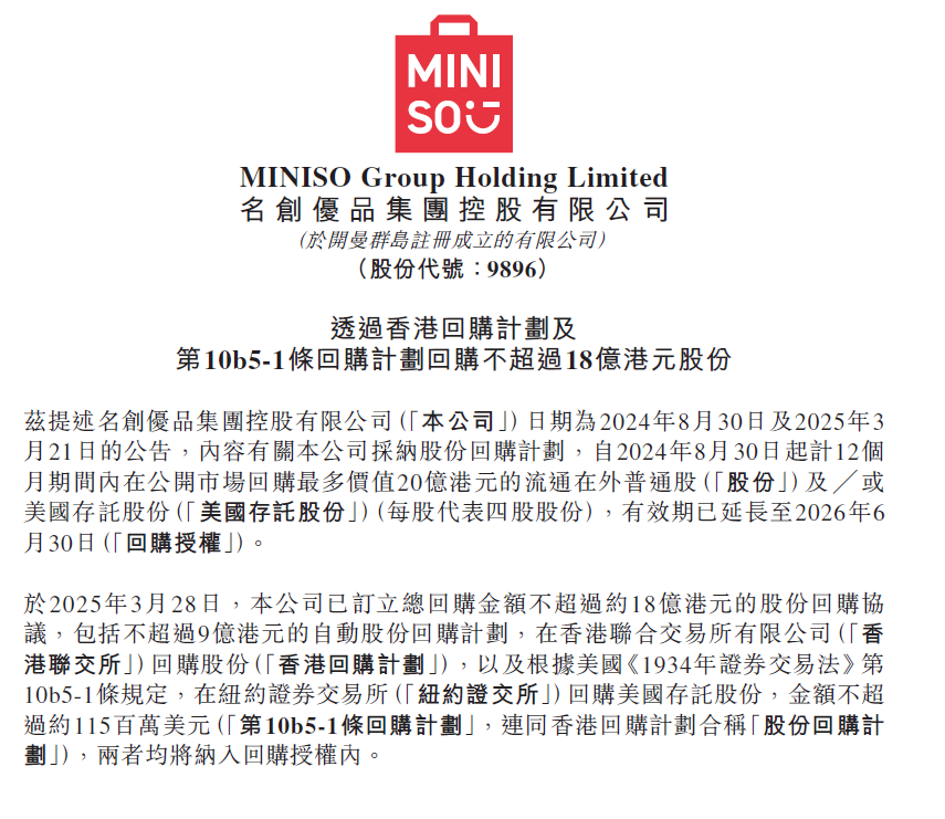 2025年3月,名创优品公告拟透过香港回购计划及第10b5-1条回购计划回购不超过18亿港元股份。包括不超过9亿港元的自动股份回购计划,在香港联交所回购股份(“香港回购计划”),以及根据美国《1934年证券交易法》第10b5-1条规定,在纽约证交所回购美国存托股份,金额不超过约115百万美元。